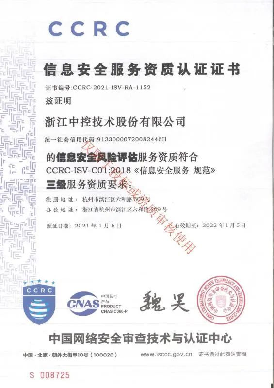 近期,中控技術成功取得信息安全的服務認證——安全集成、安全運維、風險評估方向三級(中國網絡安全審查技術與認證中心)及信息安全服務資質——安全工程類一級(中國信息安全測評中心)兩項資質。
