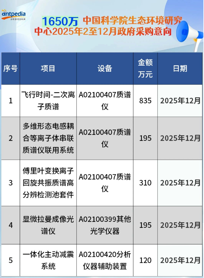 中國科學(xué)院生態(tài)環(huán)境研究中心2025年2至12月政府采購意向公開,預(yù)算金額共計(jì)1655 萬,采購項(xiàng)目5個(gè),含3個(gè)質(zhì)譜儀相關(guān)采購項(xiàng)目,1個(gè)光譜儀采購項(xiàng)目以及1個(gè)分析儀器輔助裝置。