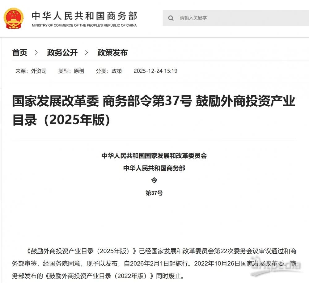 近日,經國務院同意,國家發展改革委、商務部全文發布《鼓勵外商投資產業目錄(2025年版)》(以下簡稱《鼓勵目錄》),自202621日起施行。